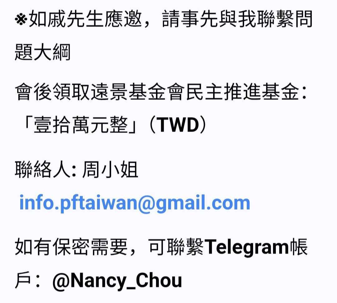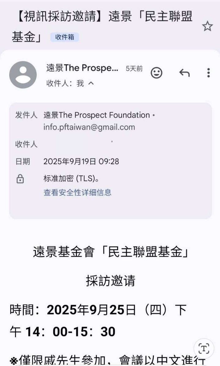 中共冒名台湾机构,意图诱骗重庆投影抗议当事人。9月19日,重庆投影抗议当事人戚洪收到冒充台湾"远景基金会"的虚假邮件,邀请参加所谓"民主推进基金"线上采访并承诺10万新台币酬劳,但基金会官方澄清,该活动纯属伪造。中国人权执行主任周峰锁指出:“这是中共常用方式,通过真真假假的人设接近异议者,诱骗他们个人信息和隐私信息,无论邀访看起来多么“正规”,都必须保持高度警惕,核实机构身份、不要轻易点击链接。https://t.co/d3uR3ObSZl