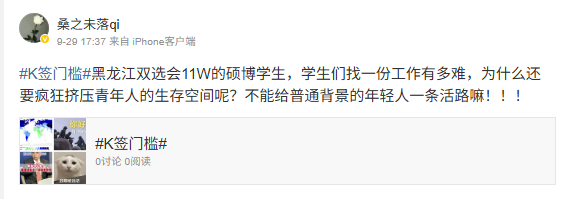 9月30日,有网友在微博发文称:黑龙江双选会有11W的硕博学生,学生们找一份都这么难,为什么还要引进国外人疯狂挤压青年人的生存空间呢?评论区有网友回应:外来人才与本地人才竞争激烈,职场如“牛马”相争,最终却让资本获利。