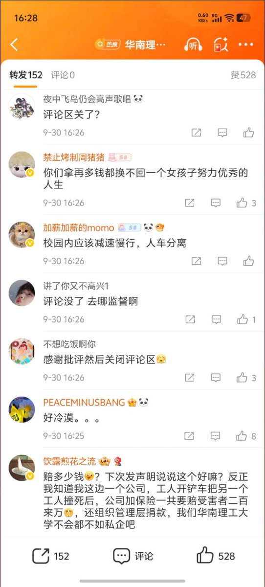 9月30日,华南理工大学在微博发布情况通报,文中写道“真诚感谢社会各界的关心、监督和批评”,然后关闭了评论区。