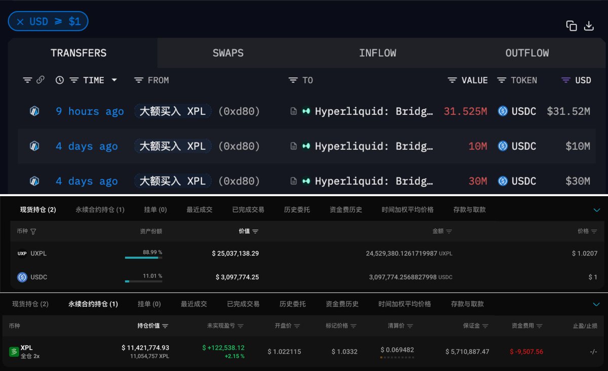 豪掷 3300 万刀买入 $XPL 的神秘巨鲸趁下跌继续加仓了!9 小时前,他向 Hyperliquid 充值 3152 万枚 USDC,随后做了两件事1️⃣ 开启 2x XPL 多单,目前持仓 1125 万万枚(1160 万美元),开仓价 $1.02,已浮盈 13.5 万美元2️⃣ 买入价值 2491 万美元的 XPL 现货,目前还有 322 万美元的资金未使用