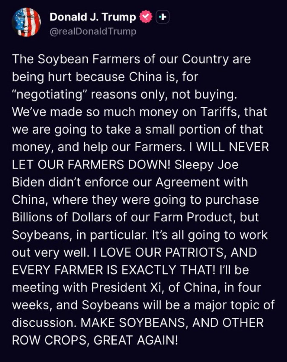 川普说马上见习近平:“我们国家的大豆农民正在受到伤害,因为中国出于“谈判”的原因,没有在购买。我们从关税中赚了这么多钱,我们将拿出一小部分这些钱来帮助我们的农民。我永远不会让我们的农民失望!