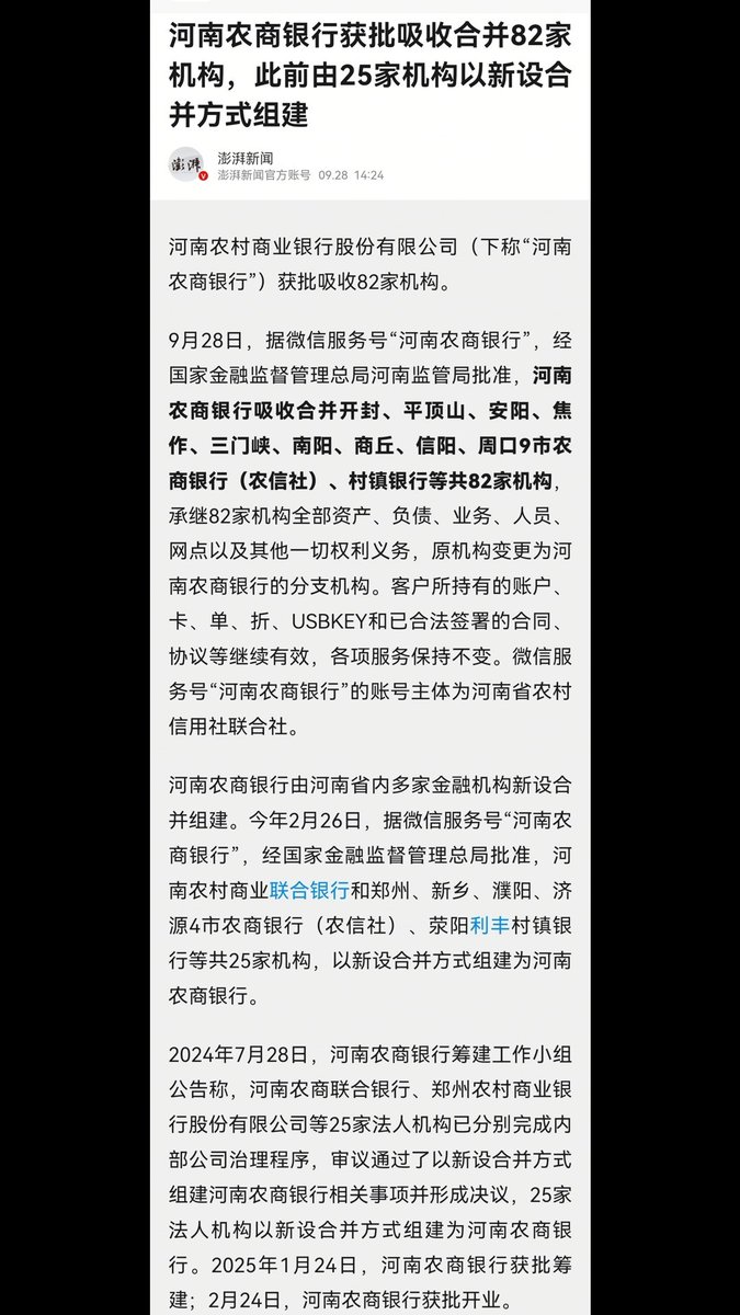 9月28日,河南农商银行第二批吸收合并河南省内农商银行、河南村镇银行共82家机构。