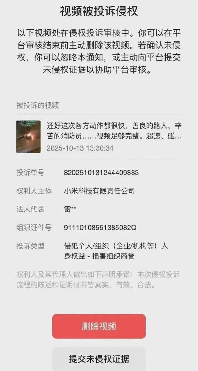 10月13日,善良小米法务部又一次“温柔”地祭出法律大杀器,优雅地投诉了那些“不识趣”发布小米汽车“自燃秀”的博主视频——毕竟,自家“安全神话”招牌决不能破。