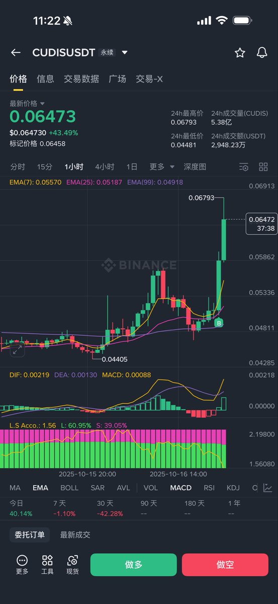 貌似又蹲到一个 $Cudis ,不过这次是真的碰运气了,跟小伙伴过Alpha+合约表单的时候筛到了这个标的,恰好大盘回调情绪一般就建了头仓。这个标跟昨晚 $Bless 不一样的是做空的人还不太多,博弈还没那么激烈,所以后续方向的确定性没有那么高。