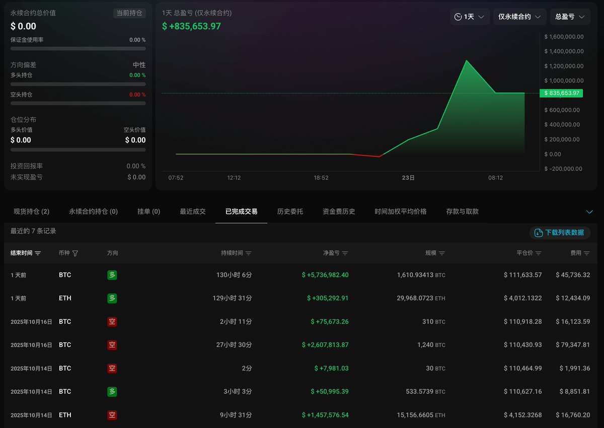 更新:「100% 胜率神秘巨鲸」已在一小时前清仓止盈,最终获利 83.5 万美元 —— 过去半个月 8 次杠杆胜率 100%!凌晨三点他一度将 $BTC 空单加仓至 1,018.75 枚(约 1.1 亿美元),随后在今天七点左右分批平仓,尽管没有平在短期低点但仍然盈利离场,保持全胜战绩传送门 👉