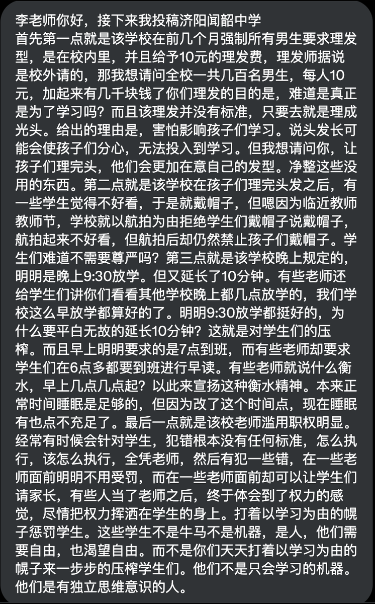 济阳闻韶中学 学生投稿这些学生不是牛马不是机器,是人,他们需要自由,也渴望自由。而不是你们天天打着以学习为由的幌子来一步步的压榨学生们。他们不是只会学习的机器。他们是有独立思维意识的人。