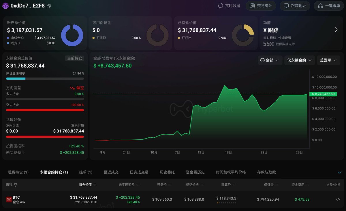 又冒出来一个战绩还不错的地址 40x 做空 $BTC 👀地址 0xdDc...aE2F8 一小时前向 Hyperliquid 充值 300 万枚 USDC,随后开启 BTC 空单,目前持仓 291.81 枚(约 3173 万美元),开仓价 $109,560.3,已浮盈 20.2 万美元该地址自九月起累计获利 870 万美元,关联地址 0x0C7...dB3B8 1011
