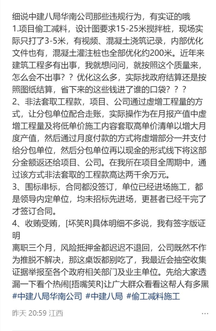 网友投稿:中建八局华南公司离职员工在在小红书举报公司违规行为。