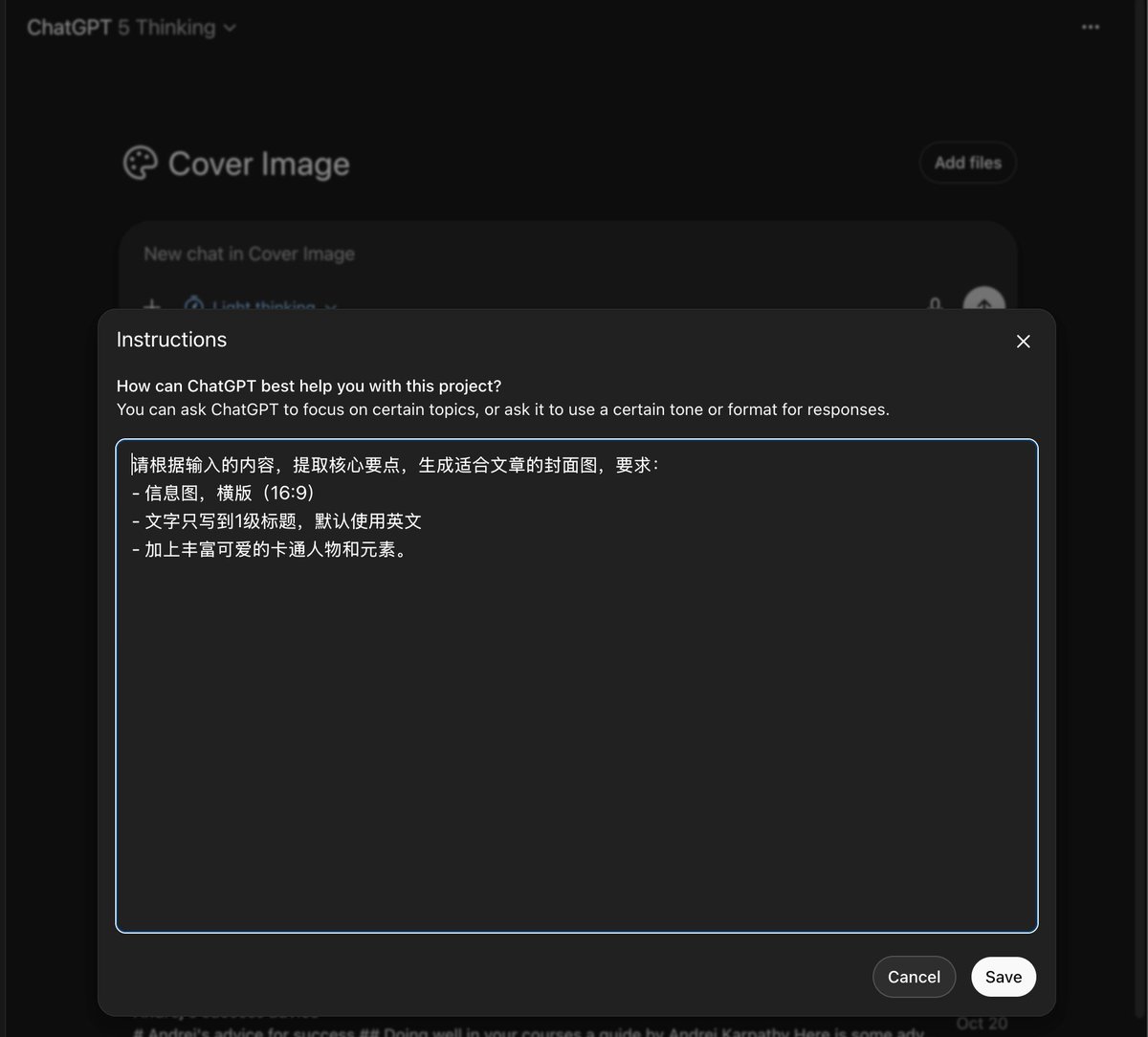 让 ChatGPT 生成封面图的提示词,可以做成 ChatGPT Project,使用时粘贴你写的文章即可---提示词开始----请根据输入的内容,提取核心要点,生成适合文章的封面图,要求:- 信息图,横版(16:9)- 文字只写到1级标题,默认使用英文- 加上丰富可爱的卡通人物和元素。