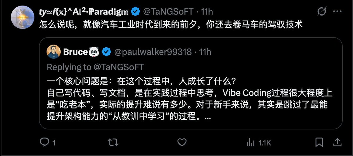 无论是“要让AI成为编程架构师”,“写提示词只要掌握meta prompt,完全可以和LLM交互几轮来确定”,还是“汽车工业时代到来的前夕,你还去卷马车的驾驭技术”,我不太喜欢这类观点,于是每次忍不住要说两句。