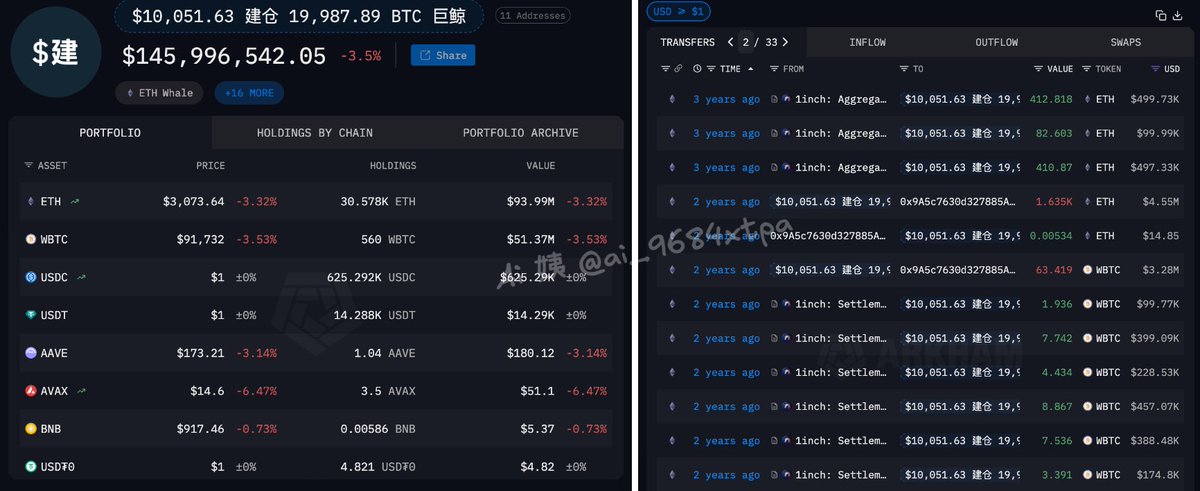 两个地址在 2024.02-2025.02 期间以均价 $66,169.48 买入了 2,189.23 枚 BTC,累计花费 1.44 亿美元;随后他将代币分发至多个地址,其中地址 0x9b8...822d8 20 分钟前向 #Binance 充值 250 枚 BTC,若卖出将获利 628.3 万美元