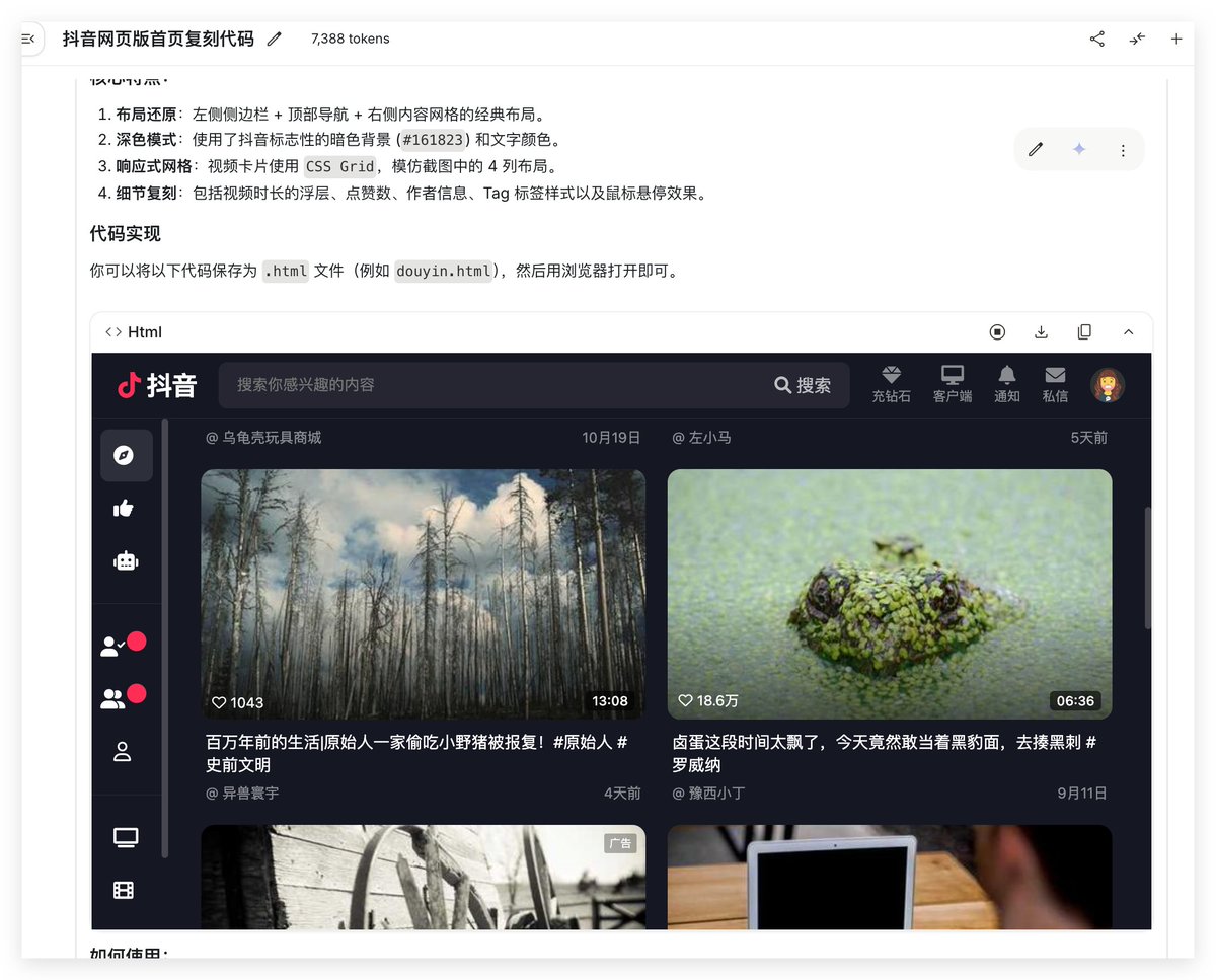 离谱,Gemini3十几秒复刻一个抖音首页,以前Gemini2.5花了10分钟也出不来