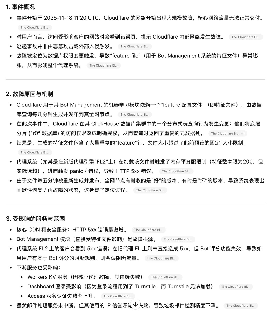 cloudflare 事故报告出来了,一行 rust 代码 panic 瘫痪了全球一半流量,具体细节 AI 有解释,但是最重要的是 CloudFlare 内部 code style 很不规范啊,线上的 unwrap() 是一定要完全禁止的,这个世界就是一个巨大的草台班子,非常惨痛的教训