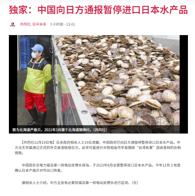 11月19日,据日本共同社报道,中国政府今天早晨通过外交渠道正式向日方通报:将暂停进口所有日本水产品。