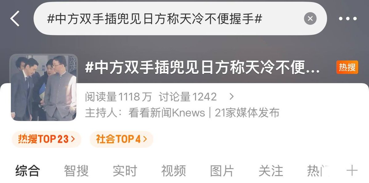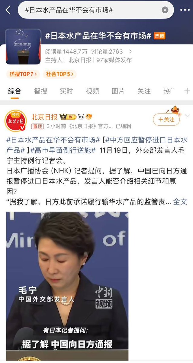 11月19日,多条日本相关话题刷屏微博热搜榜。其中:#日本水产品在华不会有市场# 位列热搜第7位#日本经济绷不住了# 位列第8位#日本间谍网曾在中国无孔不入# 排名第22位#中方双手插兜见日方称天冷不便握手# 排名第30位