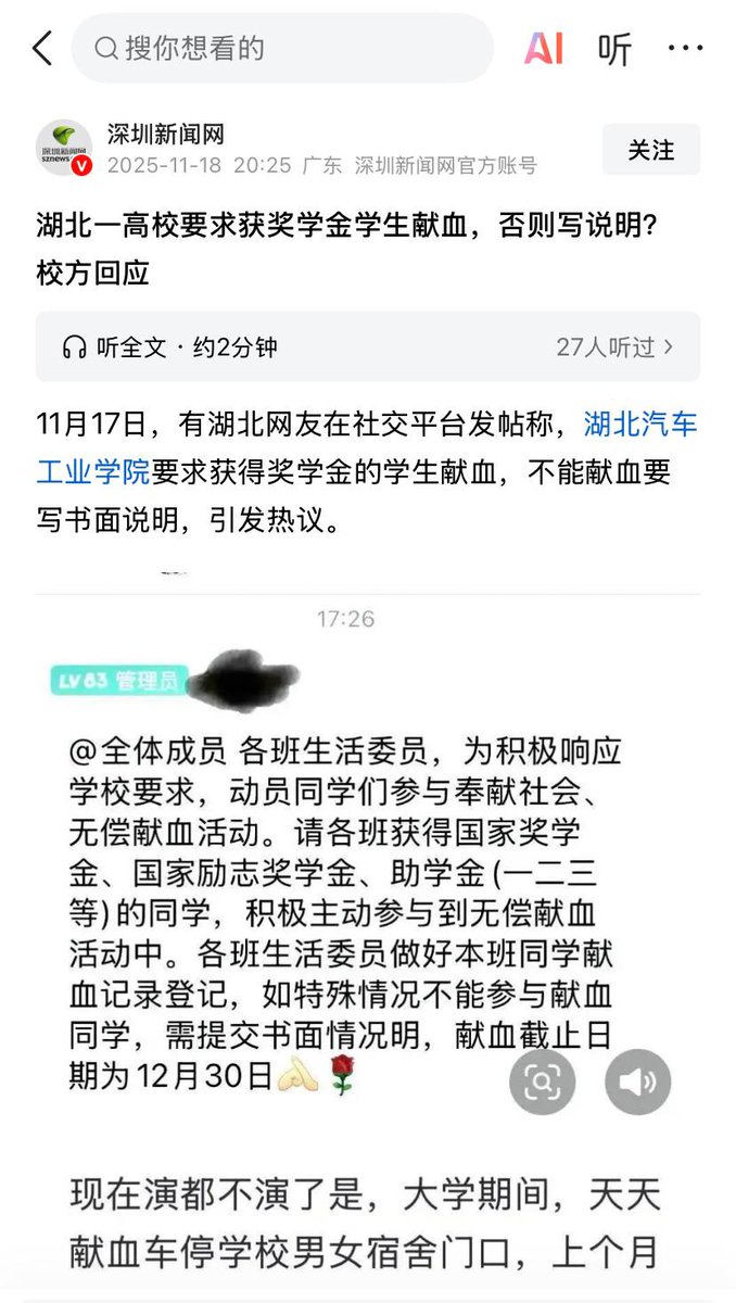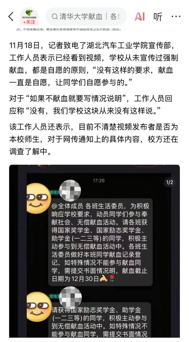 11月17日,有湖北网友在社交平台发帖称,湖北汽车工业学院要求获得奖学金的学生献血,不能献血要写书面说明,引发热议。