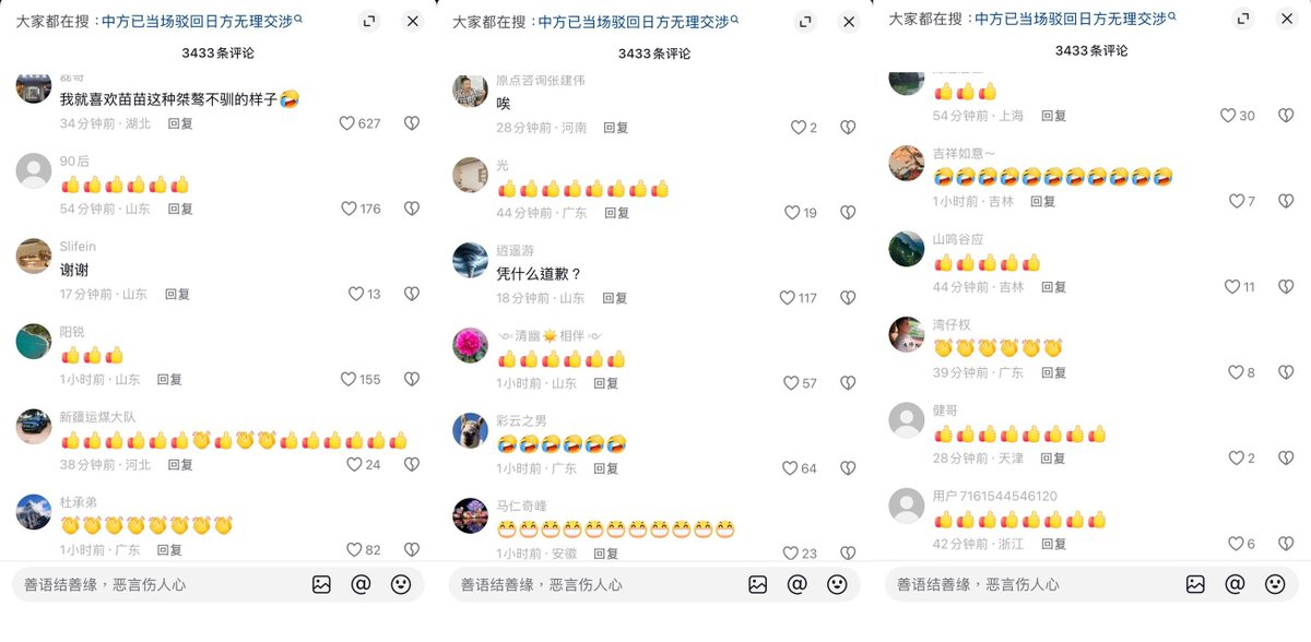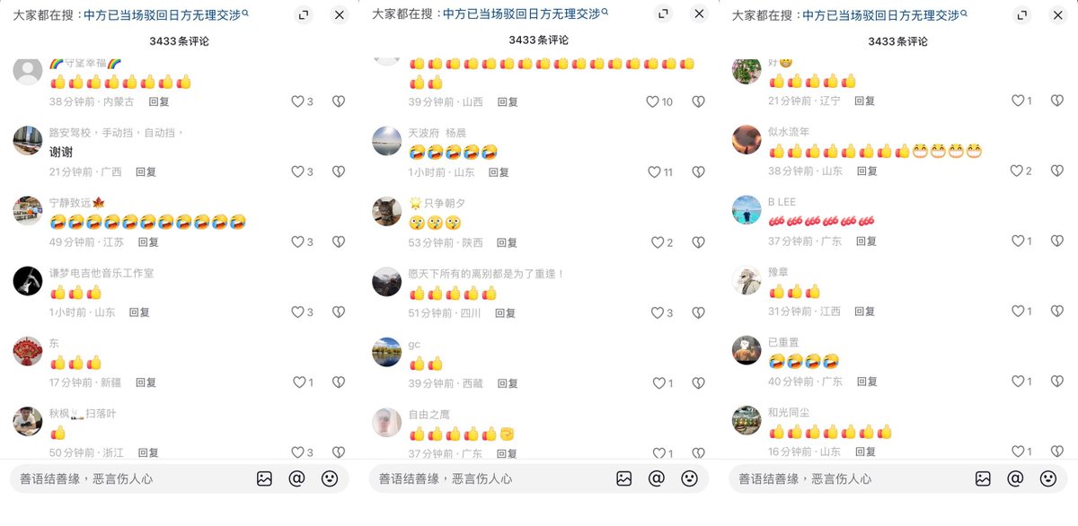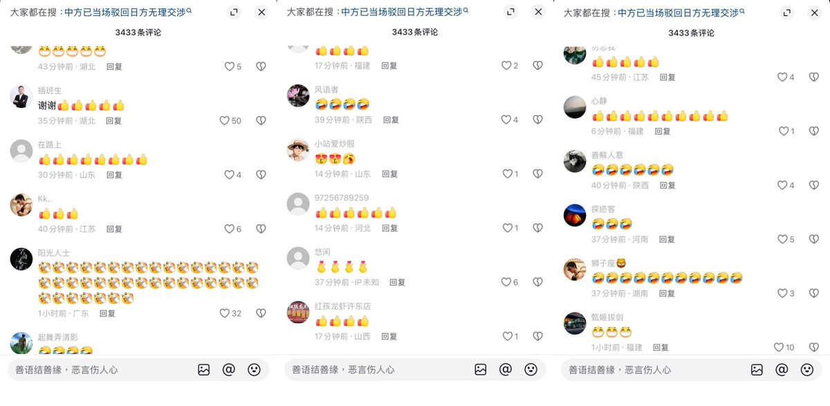 近日,在官媒发布的“中方已当场驳回日方无理交涉”的视频后,评论区被网友用各类阴阳怪气的 emoji 刷屏。据日本共同社报道,日本外务省已正式拒绝中方提出的全部要求,并明确表示不会道歉。这种战狼式外交和大字报式的恫吓,既吓不住日本人,也唬不了国人。