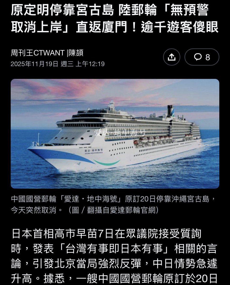 中日外交衝突,中共把民眾當出氣筒。有中國網民抱怨「黨已幫你取消赴日機票」。更倒霉的是兩千多人乘郵輪從廈門飄洋過海到了日本港口,黨下令不得上岸,全員返回。