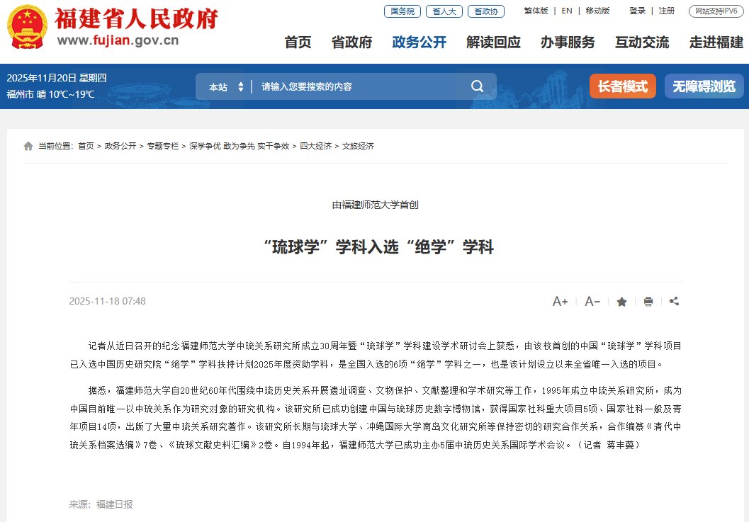 11月18日,据福建人民政府消息,福建师范大学首创的“琉球学”学科成功入选中国历史研究院“绝学”学科扶持计划2025年度资助项目,成为全国仅6项入选学科之一,也是该计划设立以来福建省唯一入选的项目。 该消息在近日举行的“纪念福建师范大学中琉关系研究所成立30周年暨‘琉球学’学科建设学术研讨会”上正式公布。