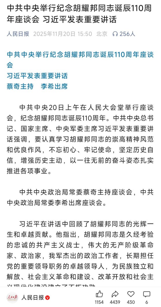 11月20日,据人民日报,中共中央举行纪念胡耀邦同志诞辰110周年座谈会,习近平发表重要讲话。