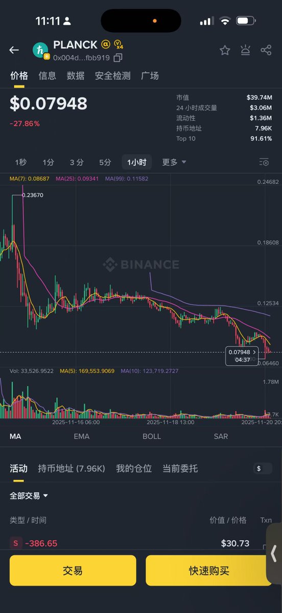 知道为啥 $GAIB 急急忙忙出声明洗白吗?看看 $PLANCK ,这是本来应该11月13号就要上合约的币。12号公告都出来了,结果13号当天宣布被推迟,而且一推就推到现在都没动静。币价维持了一段时间后拉稀了,今天直接跌了29%。而 $GAIB 是近期第二个被推迟的币,且同样没有公告推迟多久。