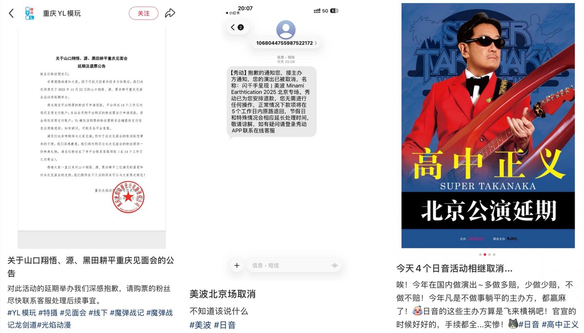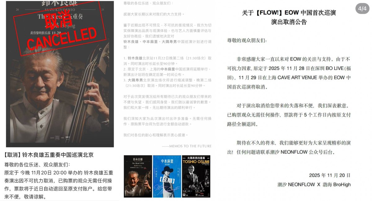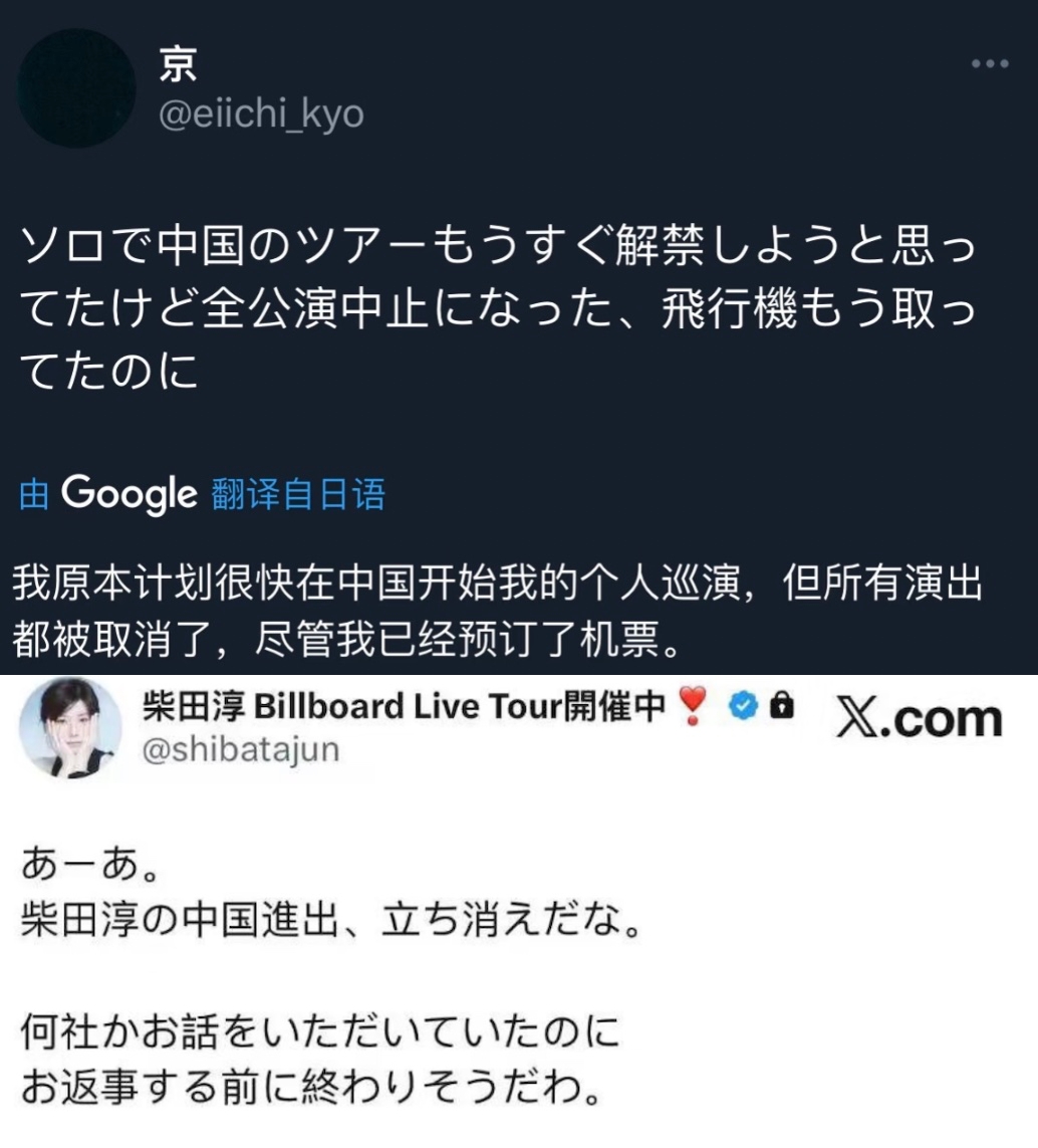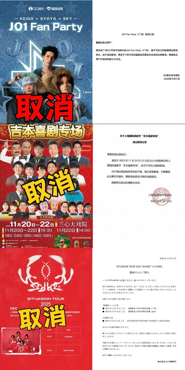 近日,随着中日关系紧张升级,一批原定在中国举行的日本艺人演出、见面会接连因“不可抗力”被取消或延期。 截至目前,已受影响的艺人包括:JO1 Fan Party、吉本喜剧专场、JSITUASION、铃木良雄、中本麻里、大隅寿男、EOW、高中正义、美波 Minami、山口翔悟・源・黑田耕平。 未官宣阶段即被取消的演出还包括:京英一(《雪国》)和柴田淳。