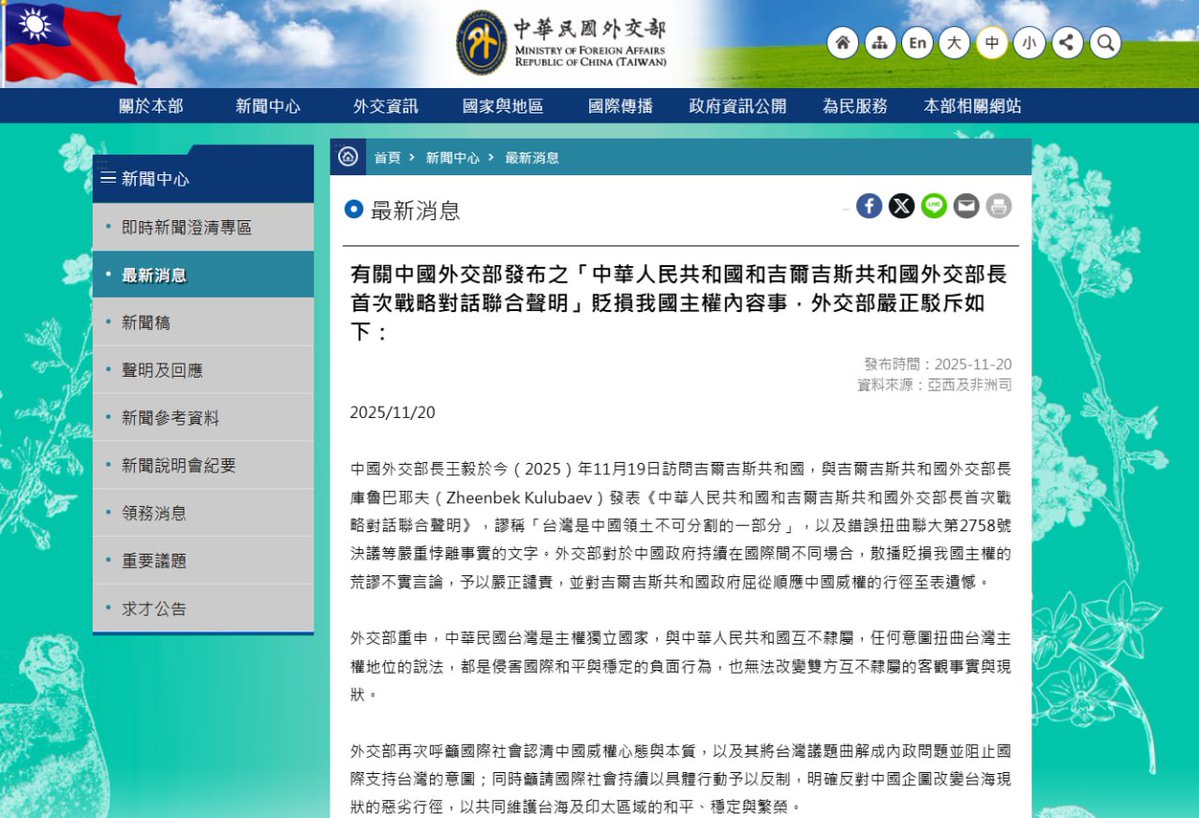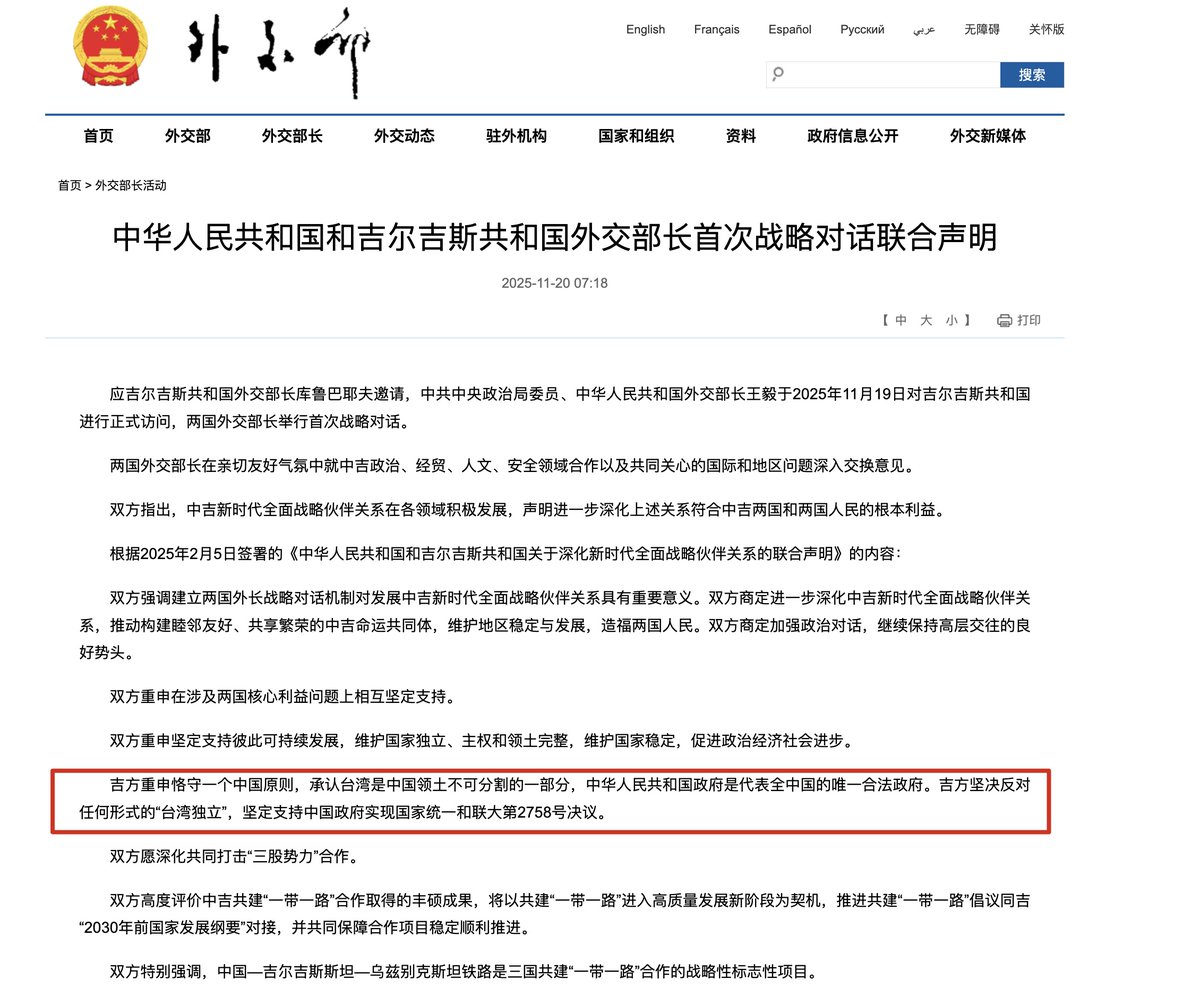 11月20日,中国外交部发布:中华人民共和国和吉尔吉斯共和国外交部长首次战略对话联合声明,声明中表示:吉方重申恪守一个中国原则,承认台湾是中国领土不可分割的一部分,中华人民共和国政府是代表全中国的唯一合法政府。吉方坚决反对任何形式的“台湾独立”。