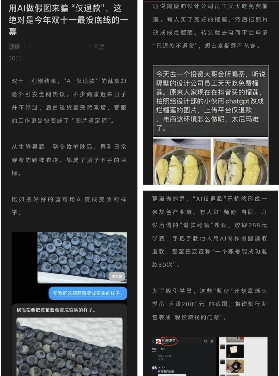 從生鮮、化妝品到內衣襪子,全被人盯上——有人拿著完好無損的藍莓,用 AI 一鍵合成成發霉爛果,點按「申請僅退款」直接白嫖。