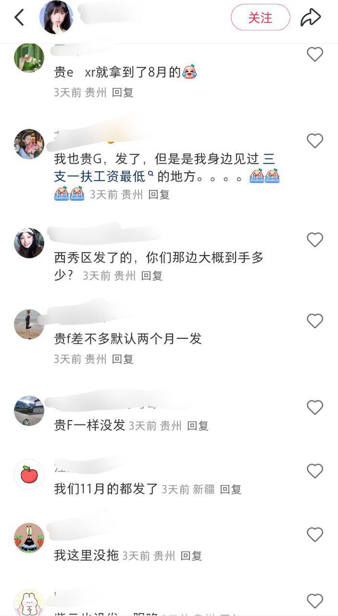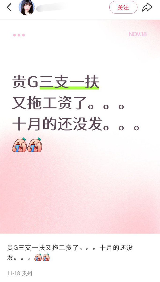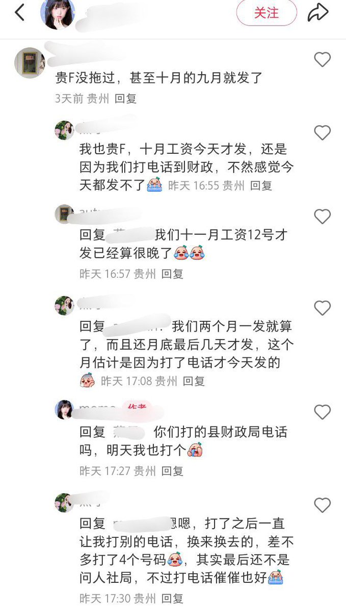 11月18日,贵州省安顺市,一名博主发帖吐槽三支一扶十个月没发工资了,评论区体制内网友纷纷表示自己也遇到了相同的情况。