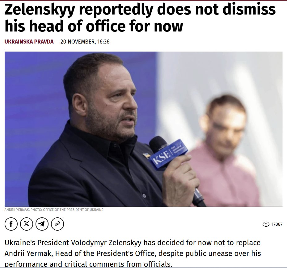 Zelensky's decision not to dismiss Yermak opens possibility of Zelensky loosing control of parliament after desertion of many of his deputies & NABU releasing tapes implicating Zelensky & his close associates in large-scale corruption.
