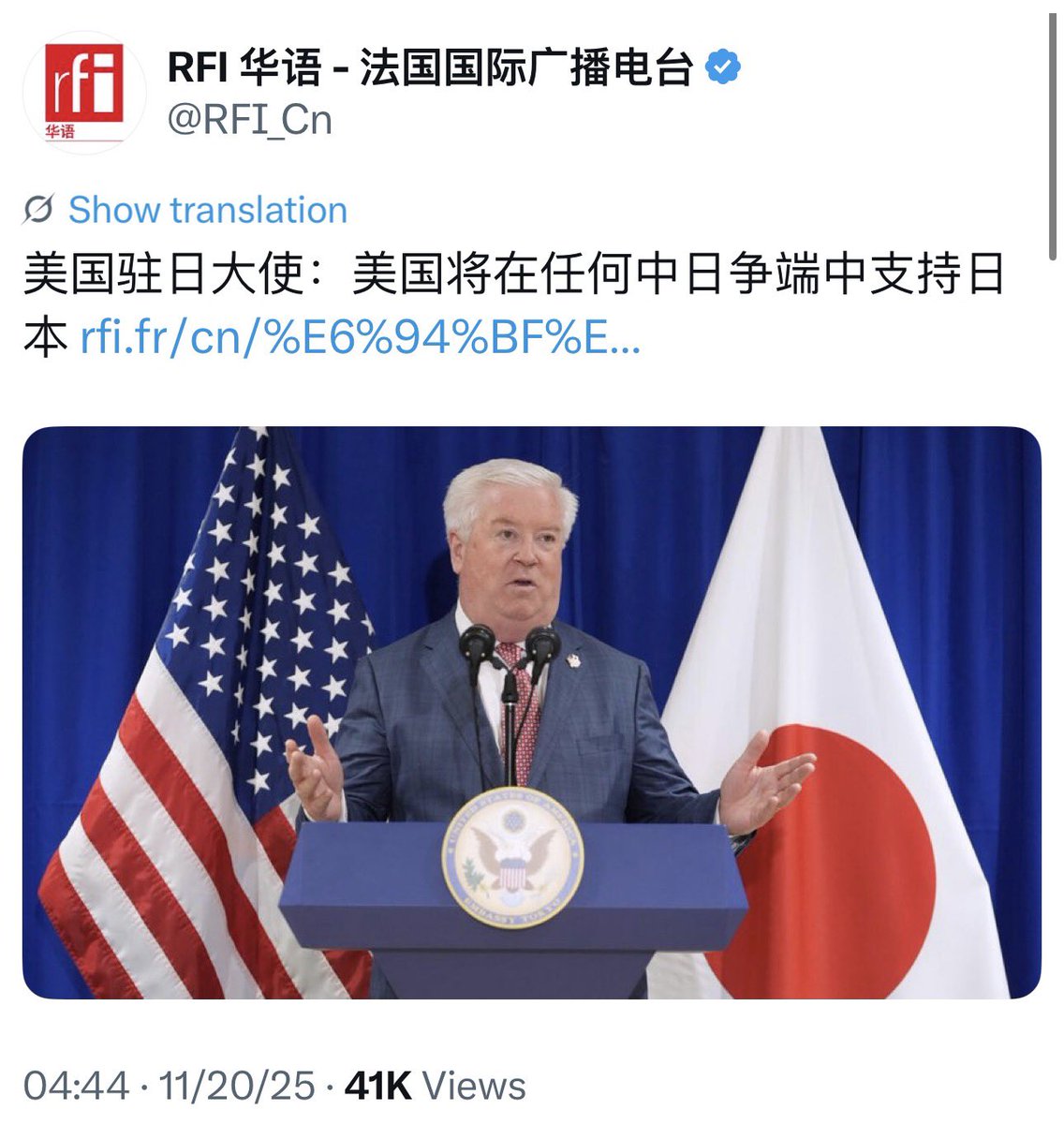 美國駐日大使表態,在中日爭端中無條件支持日本。