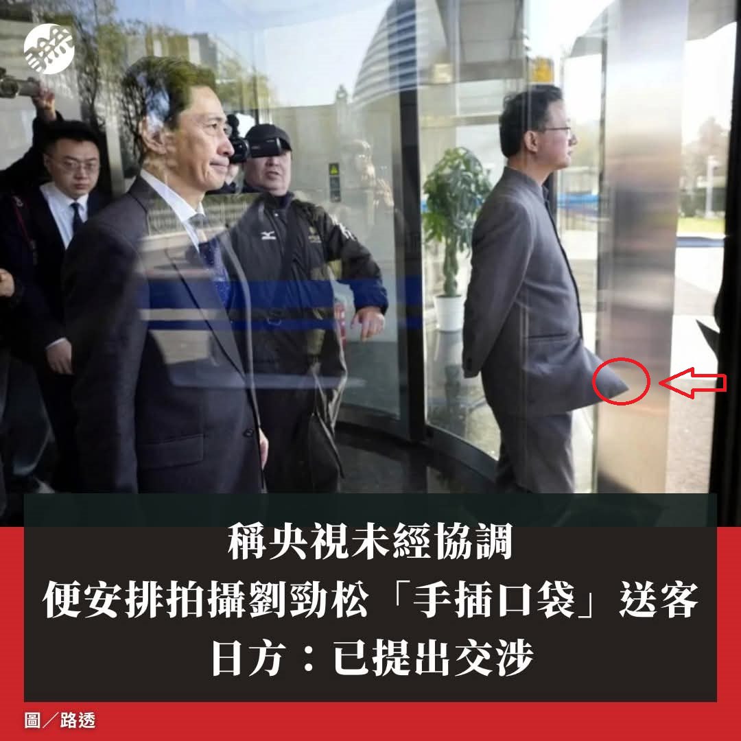 11月20日,路透社报道,日方称,央视未经协调便安排拍摄刘劲松「手插口袋」送客,已提出交涉。