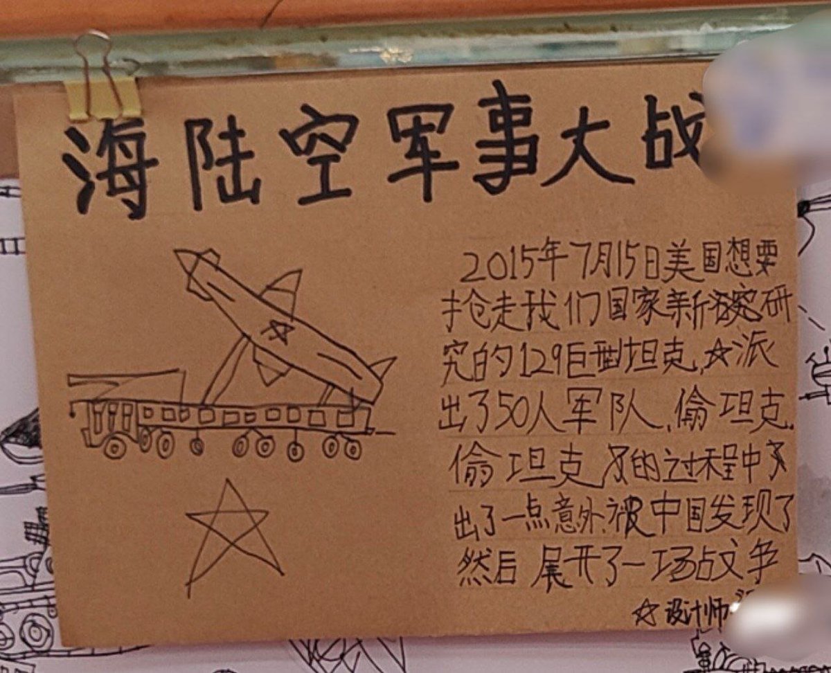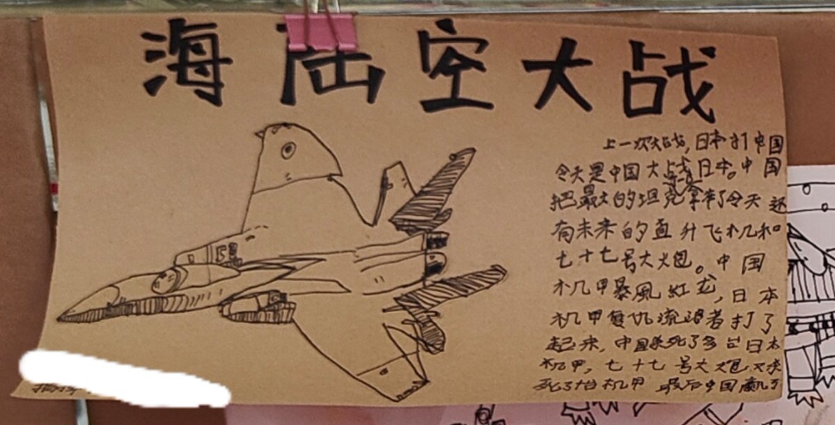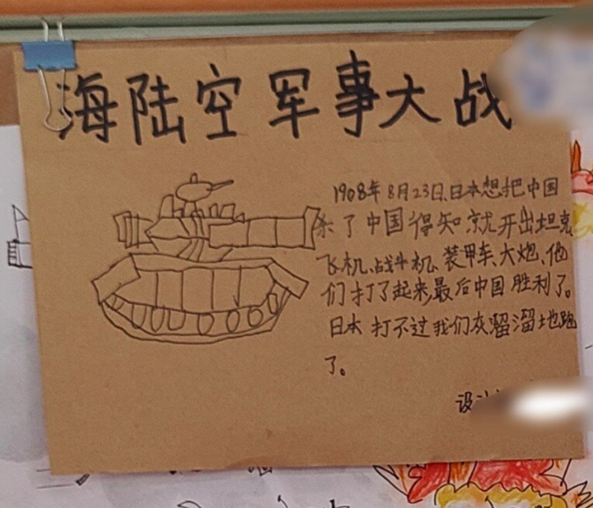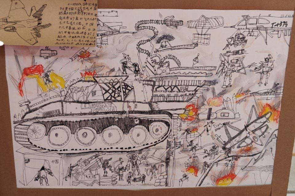 网友投稿:北京某绘画教育机构趁着这波反日风潮举办主题画展,开展仇日教育并组织儿童学员创作了一系列“中日战争”战场假想图题材的作品。