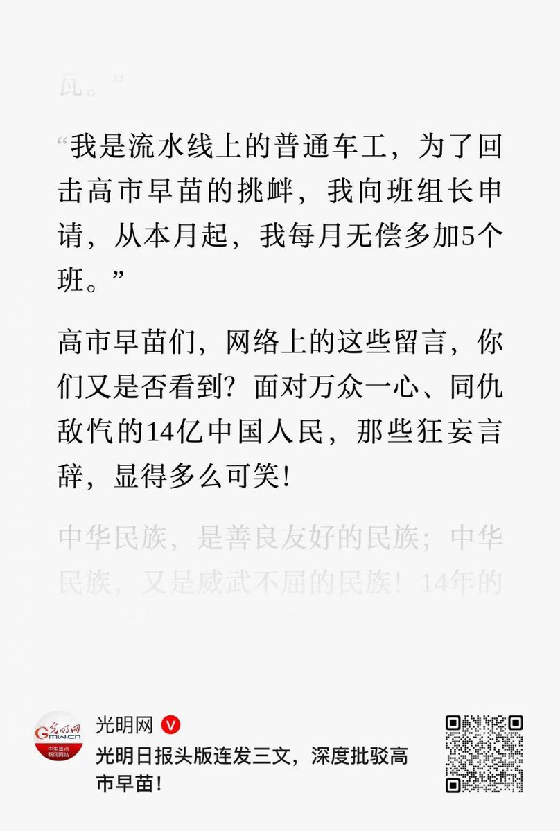 “我是流水线上的普通车工,为了回击高市早苗的挑衅,我向班组长申请,从本月起,我每月无偿多加5个班”这是人类能想出的宣传口号?