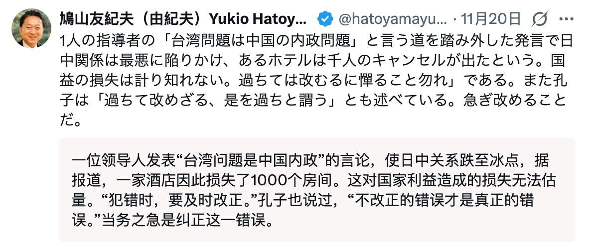 11月20日,日本前首相鸠山由纪夫公开点名批评高市,指她此番发言“行错方向”,已令国家利益面临难以估量的损失。鸠山并引用《论语》劝诫高市“过则勿惮改”“过而不改,是谓过矣”,敦促她尽快纠正错误。