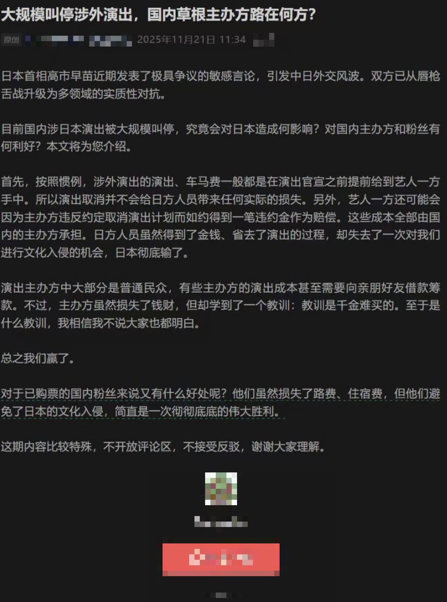 文章以“中国胜利叙事”分析了当前日本艺人来华演出大规模被叫停,对日本、对国内主办方、以及对粉丝三个方面“有何利好”。