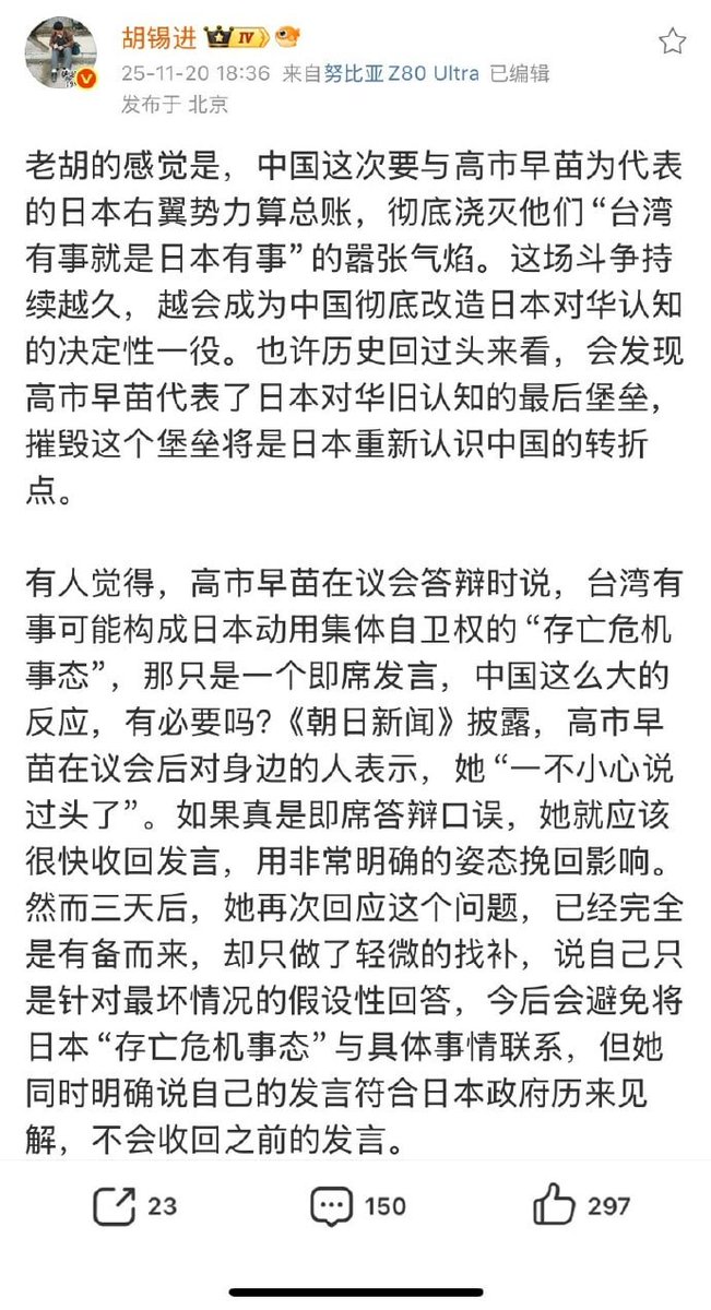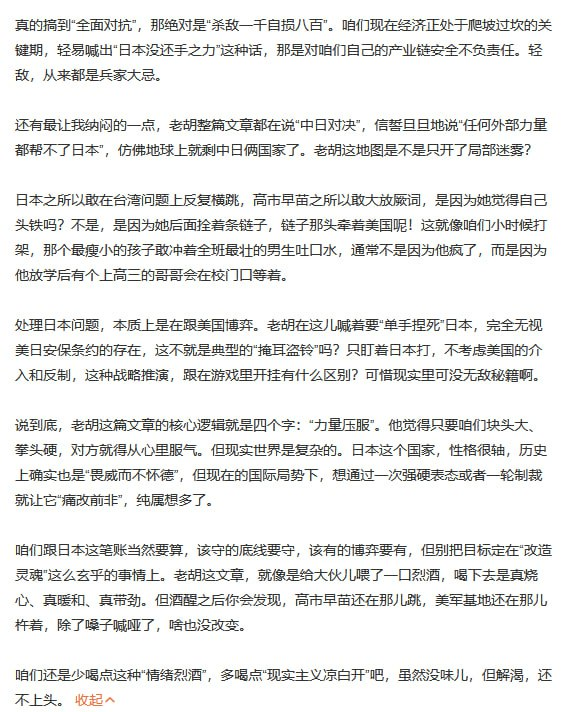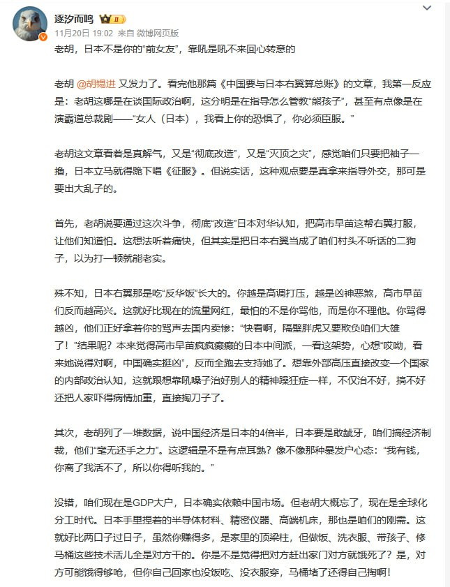 10月20日,一名网友喊话胡锡进:“老胡,日本不是你的‘前女友’,靠吼是吼不回心的。”起因是老胡发了篇《中国要与日本右翼算总账》,语气很猛:要“彻底改造”日本对华认知,给高市早苗等右翼来个“灭顶之灾”,让他们彻底怕了、服了。
