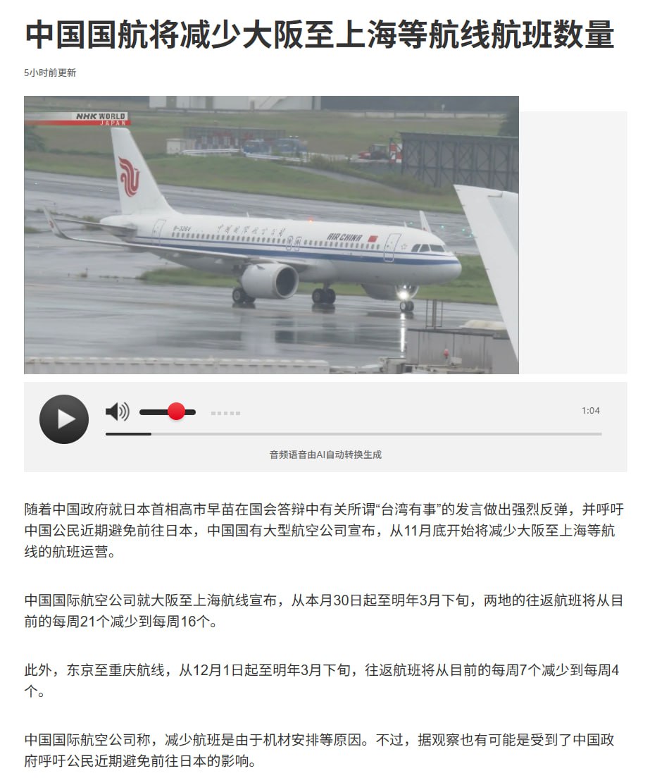 11月21日,根据NHK,中国国航将减少大阪至上海等航线航班数量。