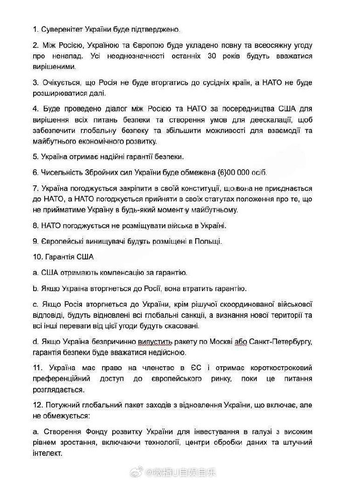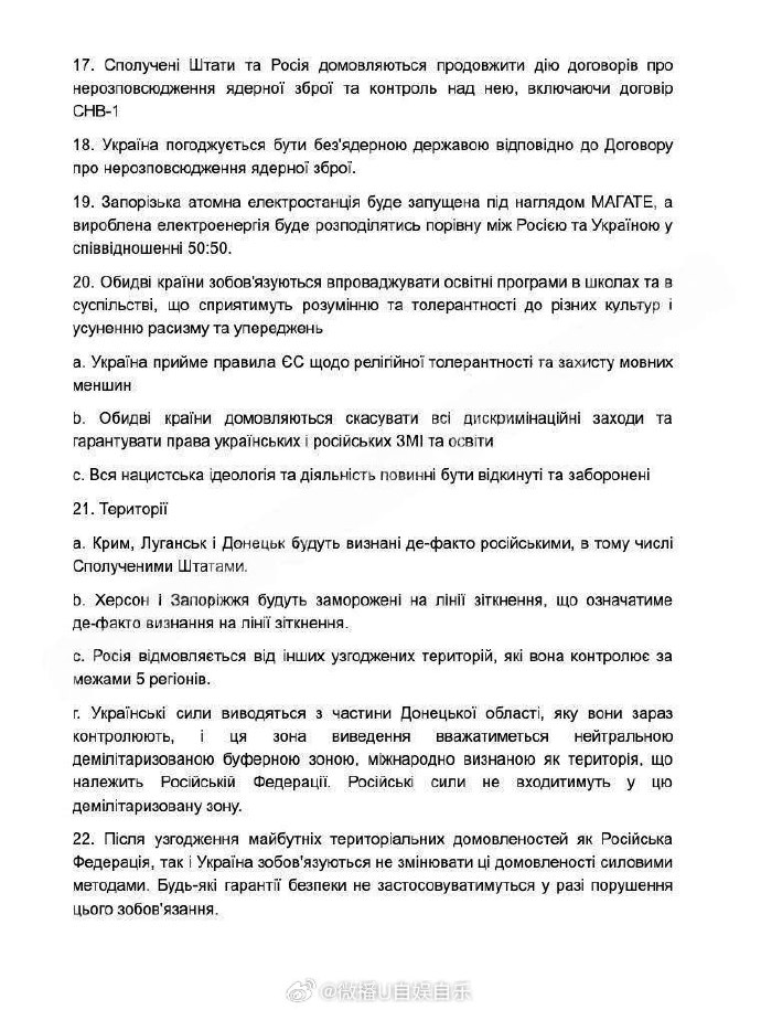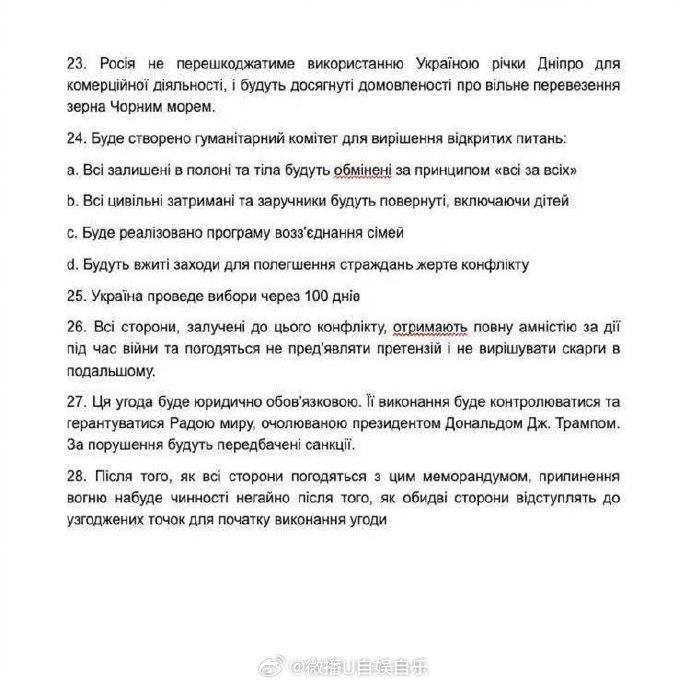 乌克兰议员洪恰连科公布了美国给的“28条”。