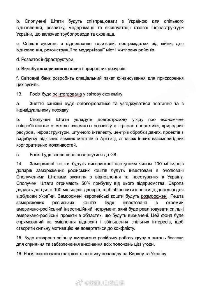 一项耗资2000亿美元的乌克兰重建计划启动,资金来自俄罗斯冻结的资产,欧洲再追加1000亿美元。一个新的美俄联合基金将启动联合经济项目。俄罗斯将分阶段重新融入全球经济,并再次受邀参加G8峰会。