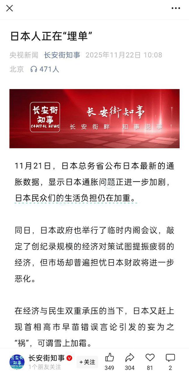 11月22日,新华社 发表文章称:日本流感疫情正在蔓延:最新数据显示,11月10日至16日,日本全国数千家定点医疗机构总计报告流感病例14.55万例,平均每家报告37.73例,每周新增病例数已连续13周增加。 11月22日,北京日报社旗下媒体「长安街知事」 发表了 一篇文章,表示日本人正在“ 埋单”在经济与民生双重承压的当下,日本又赶上现首相高市早苗错误言论引发的妄为之“祸”,可谓雪上加霜。