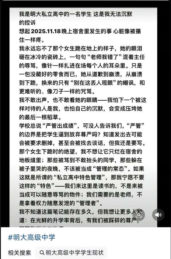 11月18日,保定明大高级中学,一名女生因宿舍“零食未藏好”被宿管主任当众辱骂,最终情绪崩溃跪在地上连声道歉。 据知情学生描述,对方持续以 “别在这丢人现眼”等羞辱性的嘲讽,和更难听的、像刀子一样的咒骂 对女孩儿进行施压。
