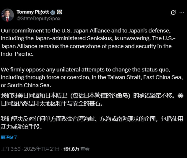 11月21日,美国国务院发言人皮戈特(Tommy Pigott)下午透过社群媒体X表示:我们对美日同盟和日本防卫(包括日本管辖的钓鱼岛)的承诺坚定不移。美日同盟仍然是印太地区和平与安全的基石。我们坚决反对任何单方面改变台湾海峡、东海或南海现状的企图,包括使用武力或胁迫手段。