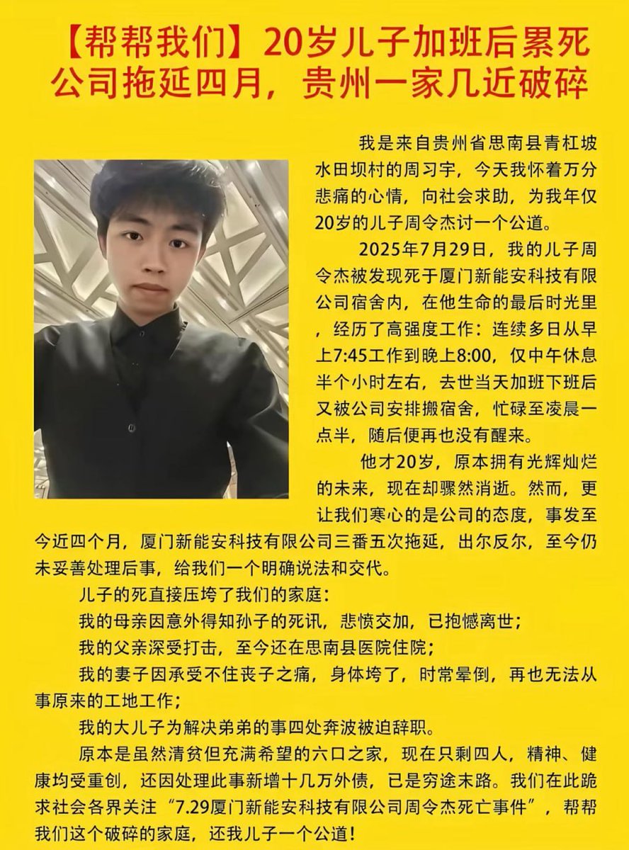 11月23日,贵州省思南县,青杠坡水田坝村。周令杰父亲,周习宇发帖求助,其年仅20岁的儿子周令杰讨一个公道。2025年7月29日,他在厦门新能安科技有限公司宿舍因高强度加班离世:连续多日从早上7:45工作到晚上8:00,仅半小时午休,当天下班后还被安排搬宿舍,忙碌至凌晨1:30再也没有醒来。