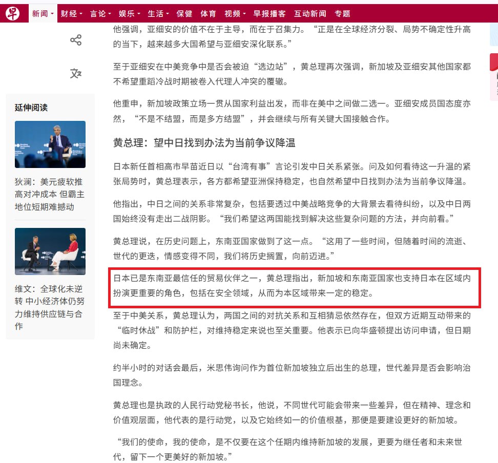 11月20日,新加坡联合早报报道:新加坡总理黄循财星期三(11月19日)出席彭博创新经济论坛晚宴,与彭博新闻社总编辑米思伟(John Micklethwait)对话时,强调:日本已是东南亚最信任的贸易伙伴之一,黄总理指出,新加坡和东南亚国家也支持日本在区域内扮演更重要的角色,包括在安全领域,从而为本区域带来一定的稳定。