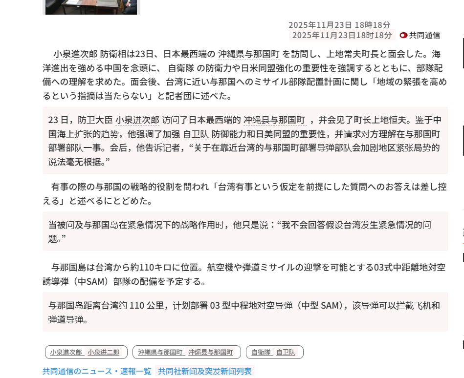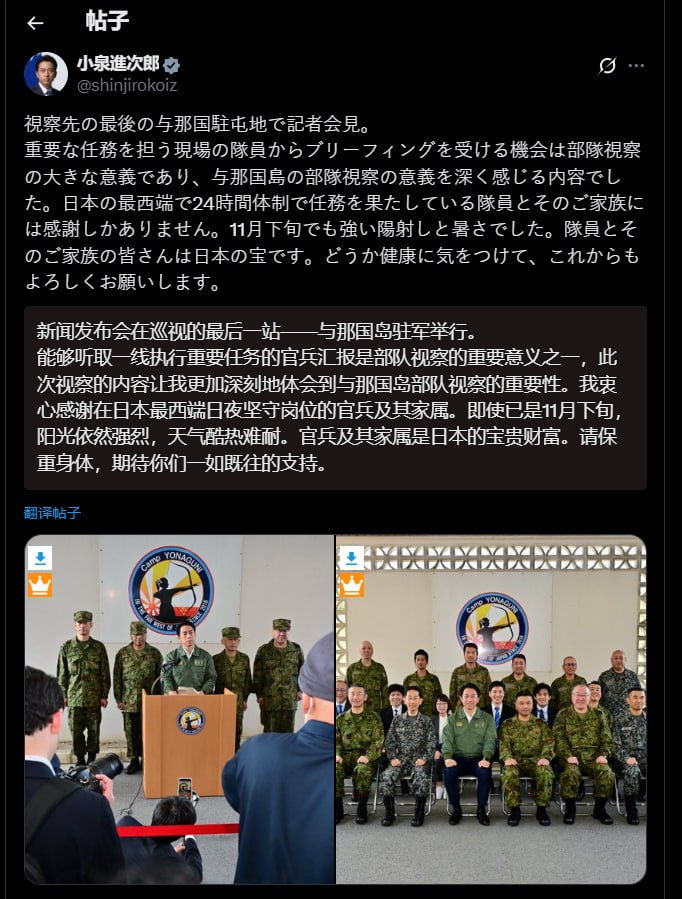 11 月 23 日,日本防卫大臣小泉进次郎访问了日本最西端的冲绳县与那国町,并与町长上地恒夫会面。鉴于中国持续推进海上扩张,小泉强调了强化自卫队防卫能力以及稳固日美同盟的重要性,并向地方说明、争取理解政府在与那国岛部署部队的计划。