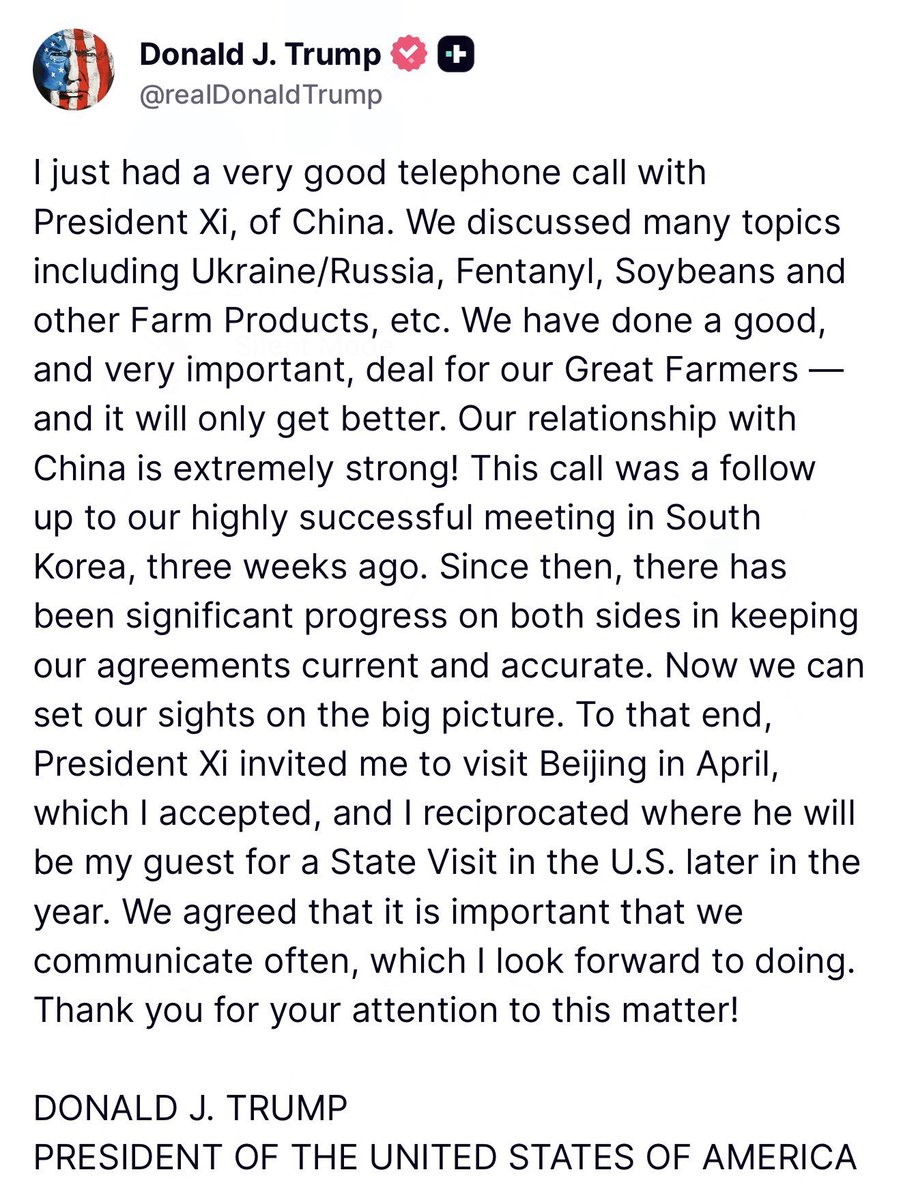 “我刚刚与中国国家主席习近平进行了一个非常良好的电话通话。我们讨论了许多议题,包括乌克兰/俄罗斯、芬太尼、大豆和其他农产品等。我们已经为我们伟大的农民达成了一项良好且非常重要的协议——而且情况只会越来越好。我们与中国的关系非常强劲!