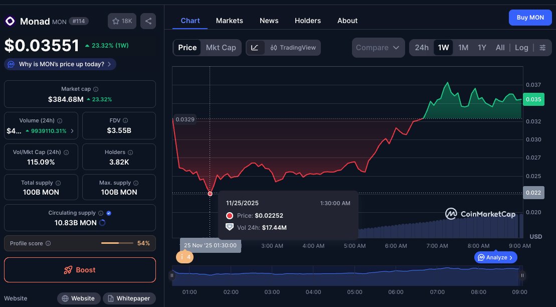 结果最Emo的时候大部分人交出筹码后, @monad 直接把币价爆拉80%,到了0.038附近。等昨晚忍痛割肉的人睡醒可能又得再痛一次,当然如果追进去会不会再继续痛就不好说了,哈哈。