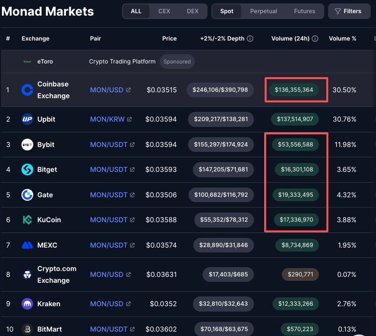 但博弈最激烈的TGE Day结束后,双方谈判的难度应该会减小,毕竟现货交易量在那摆着,币安不吃别的所吃的满嘴流油的,而Monad肯定也想要币安更好的现货流动性。
