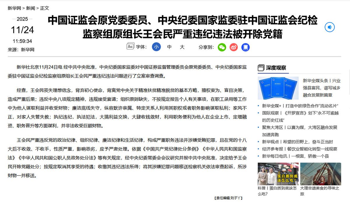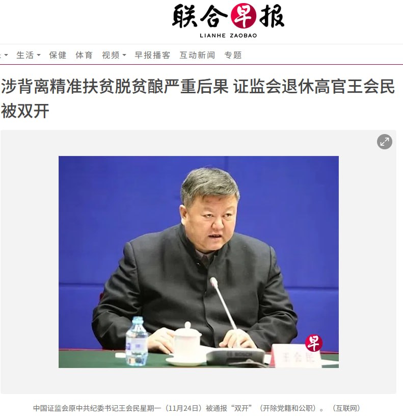 11月24日,出现反腐新话术“背离精准扶贫脱贫”。中国证券监督管理委员会原中共纪委书记王会民 被通报“双开”(开除党籍和公职)。这名“老金融”被指背离党中央精准扶贫精准脱贫的基本方略,擅权妄为、盲目决策,造成严重后果;利用职务便利为他人在企业上市、定增融资、职务晋升等方面谋利。